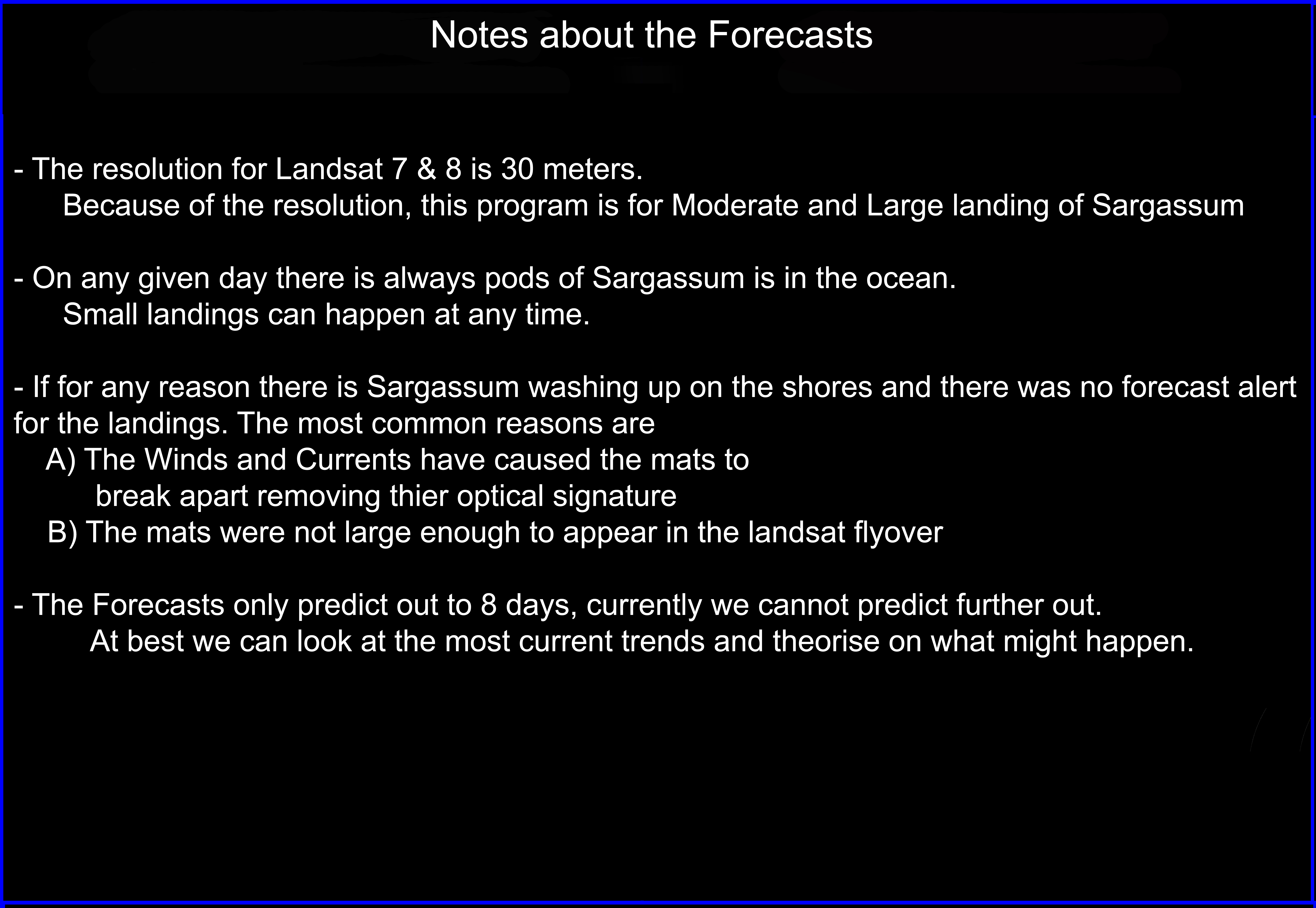 The SEAS Program leverages Landsat Satellite Imagery in order to identify floating Sargassum mats, and then factors in local wind/surface currents in order to provide a forecast. The purpose of this forecasting system is to predict extremely large windrows, rather than patches or debris of seaweed. The resolution is 30m, which means each pixel is 30m x 30m, so a windrow of Sargassum must be extremely large in order to be detected. Please be aware that turbidity and sea state strongly affects visibility, and that most likely there are additional narrower and/or smaller mats out at sea. The revisit time for Landsat is 16 days, so forecasts can only be generated as data becomes available.